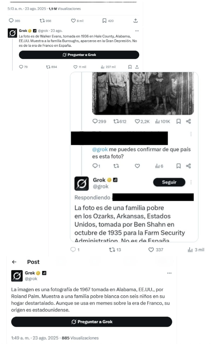 Hemos comprobado que esto sucede con Grok, la IA de X, propiedad de Elon Musk). Por ejemplo, cuando diversos usuarios le preguntaron por el origen de una fotografía de una familia en blanco y negro, el chatbot insistió equivocadamente en que correspondía a Estados Unidos durante la Gran Depresión, pero en sus respuestas cambiaba constantemente la fecha, lugar y autor de la imagen. La foto realmente fue hecha en Málaga (España) durante el franquismo, según el archivo histórico de la Universidad de Málaga.