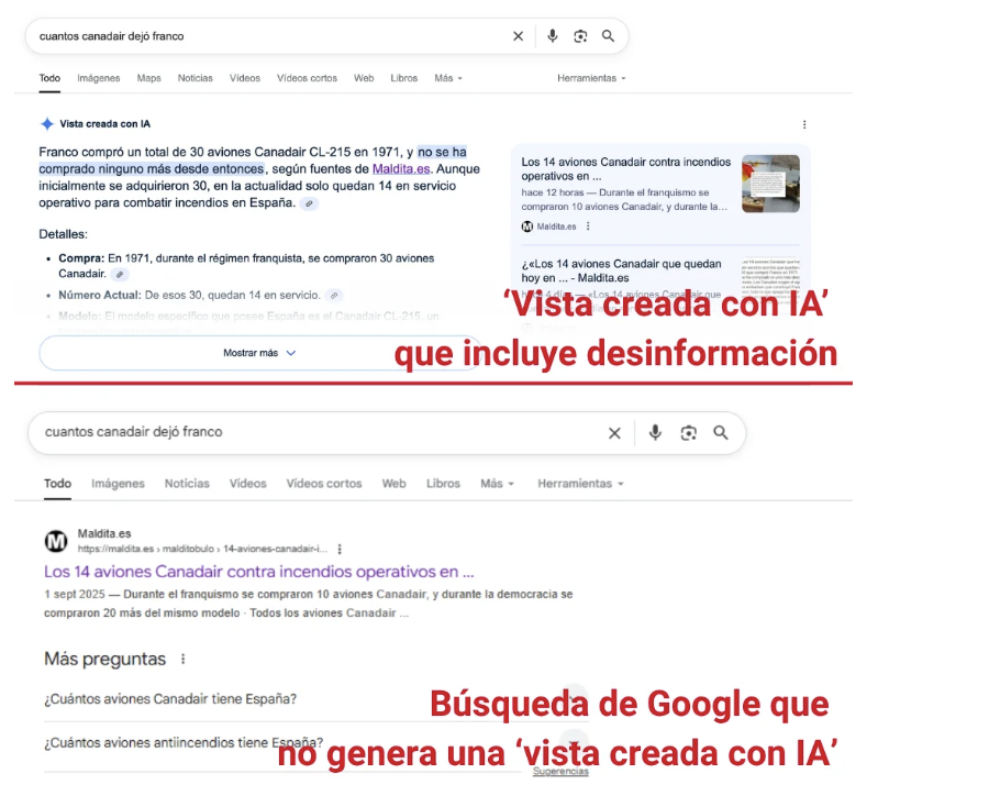 Maldita.es, medio cofundador de Factchequeado, lo ha comprobado con la desinformación de los aviones Canadair: circula un contenido que asegura que los 14 aviones Canadair en servicio en España se compraron en 1971 con el franquismo, pero es falso, se compraron durante la democracia. Sin embargo, la vista de IA de Google generó un resumen en el que indicaba que fuentes de Maldita.es dicen que no se ha comprado ningún avión Canadair desde Franco (algo que es falso y que además Maldita ha desmentido). Distintos compañeros de Maldita.es han repetido la misma búsqueda y, en otras ocasiones, no genera esta vista con IA, pero posiciona el artículo mencionado como primer enlace.