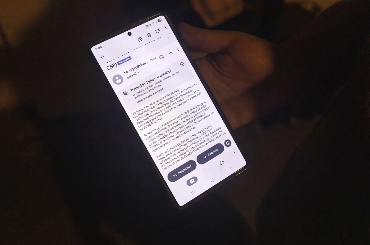 Emily, una inmigrante venezolana en Columbus, Ohio, sostiene su celular para mostrar el correo electrónico que le enviaron del programa de autodeportación de CBP Home.