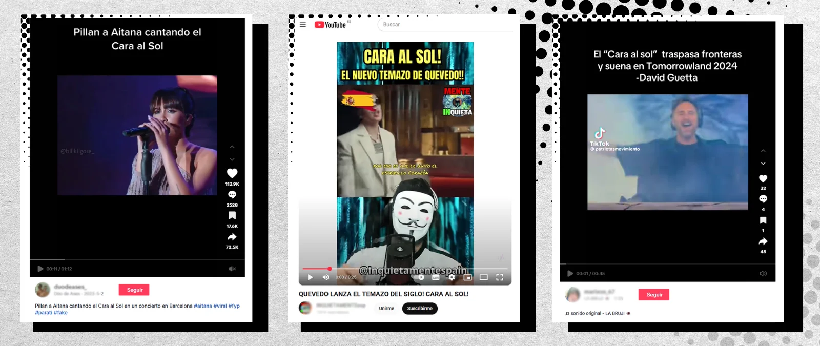 Videos manipulados donde aparecen Aitana, Quevedo y David Guetta cantando o tocando el Cara al Sol. Fuente: TikTok y YouTube