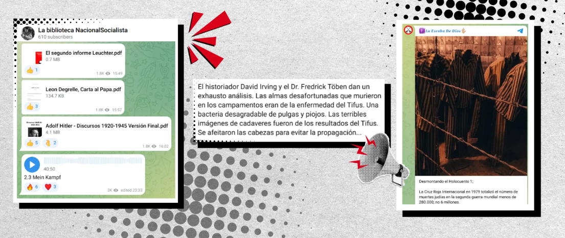 Los contenidos compartidos por esos canales de Telegram van desde capítulos del libro Mi Lucha, deHitler, tanto en audio como en pdf, pasando por la negación del número de las víctimas del Holocausto (cifrado en alrededor de seis millones por organizaciones como el Museo del Holocausto de Estados Unidos), al que llaman “el holocuento” (u “holoverso”, “holo-lavado”, “holoengaño”), libros revisionistas que se distribuyen en pdf donde se pone en duda no sólo el número de víctimas sino la existencia de cámaras de gas en los campos de concentración nazis, algo que ha sido ampliamente documentado y estudiado. En esos libros, de libre descarga, se pueden leer frases como: “El cuento del horno crematorio presentado como cámara de gas es muy interesante, porque no habiéndose encontrado jamás cámara de gas en esos campos, es un truco al que se recurrió muy a menudo”.