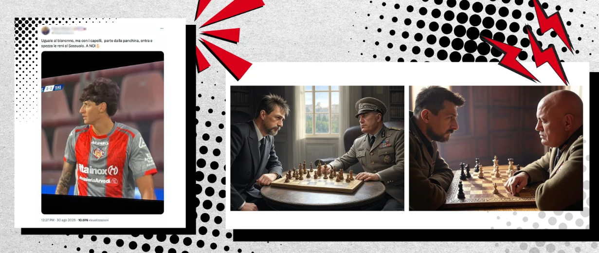 Izquierda: una publicación sobre el futbolista Romano Benito Floriani Mussolini utilizada como pretexto para lanzar el grito fascista “A noi” (“A nosotros”). Derecha: dos imágenes generadas por IA del futbolista italiano Francesco Acerbi en compañía de Hitler y Mussolini. Fuente: X