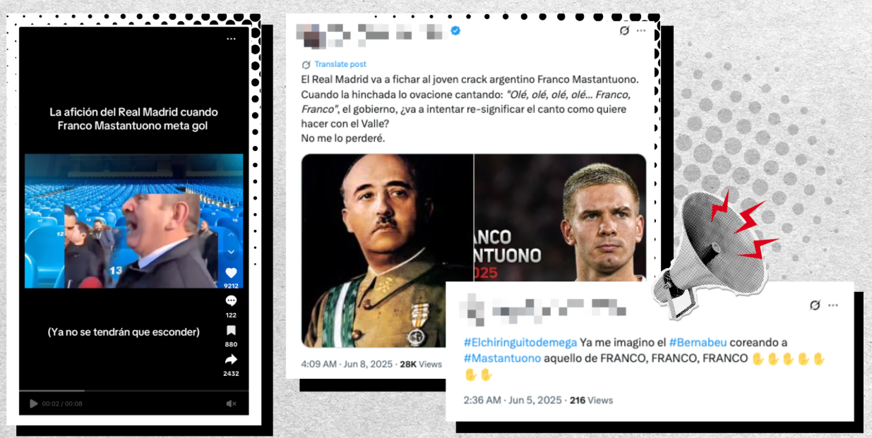 El fútbol es otro de los contextos en los que se glorifica a dictadores aprovechando fichajes y actualidad. Se utiliza el nombre y la imagen de algunos jugadores para hablar de Franco, Hitler o Mussolini. El caso con más repercusión en España recientemente fue el de Franco Mastantuono, un futbolista argentino de 18 años que firmó un contrato con el Real Madrid en el mercado de verano de fichajes de 2025. Hasta que se oficializó el traspaso, en las redes sociales se especuló sobre el futuro del centrocampista donde se pueden ver publicaciones con decenas mensajes haciendo referencia a Francisco Franco o a la dictadura franquista, aprovechando la coincidencia del nombre del argentino con el apellido del dictador.