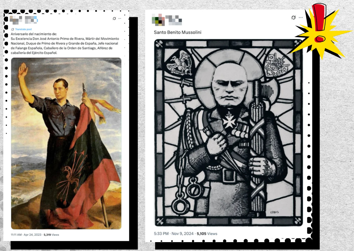 También hay una corriente de deificación o conversión de estas referencias en santos. “Existe mucha santificación de estas figuras históricas”, explicó Key Allen, doctor en Relaciones Internacionales e investigador en la Universidad de Oxford y autor de múltiples artículos sobre extremismos y redes sociales. Especialmente, cuenta el experto, aquellas que fueron ejecutadas y se presentan “como una especie de mártires del neofascismo”. Así sucede, por ejemplo, con Benito Mussolini, que fue fusilado el 28 de abril de 1945 junto a su amante, Clara Petacci, para después ser expuestos y sometidos a todo tipo de vejaciones en una plaza de Milán; o Primo de Rivera, fusilado el 20 de noviembre de 1936 tras ser acusado de conspiración contra la Segunda República y rebelión militar.
