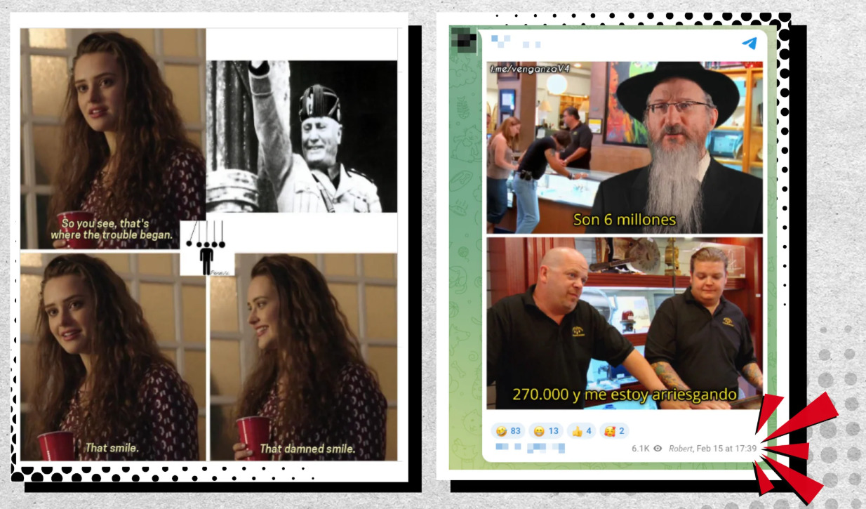 Memes con la imagen de Mussolini (izquierda) y negacionista del Holocausto (derecha). Fuente: Instagram y Telegram