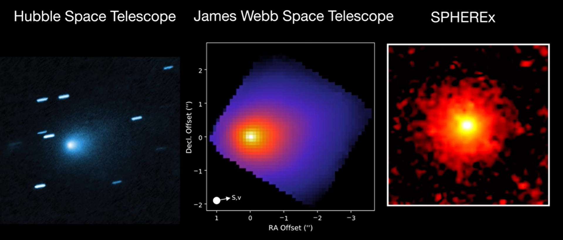 Observaciones de los telescopios espaciales Hubble, James Webb (imagen infrarroja del 6 de agosto) y SPHEREx (varias imágenes del 7 al 15 de agosto) de 3i/ATLAS.