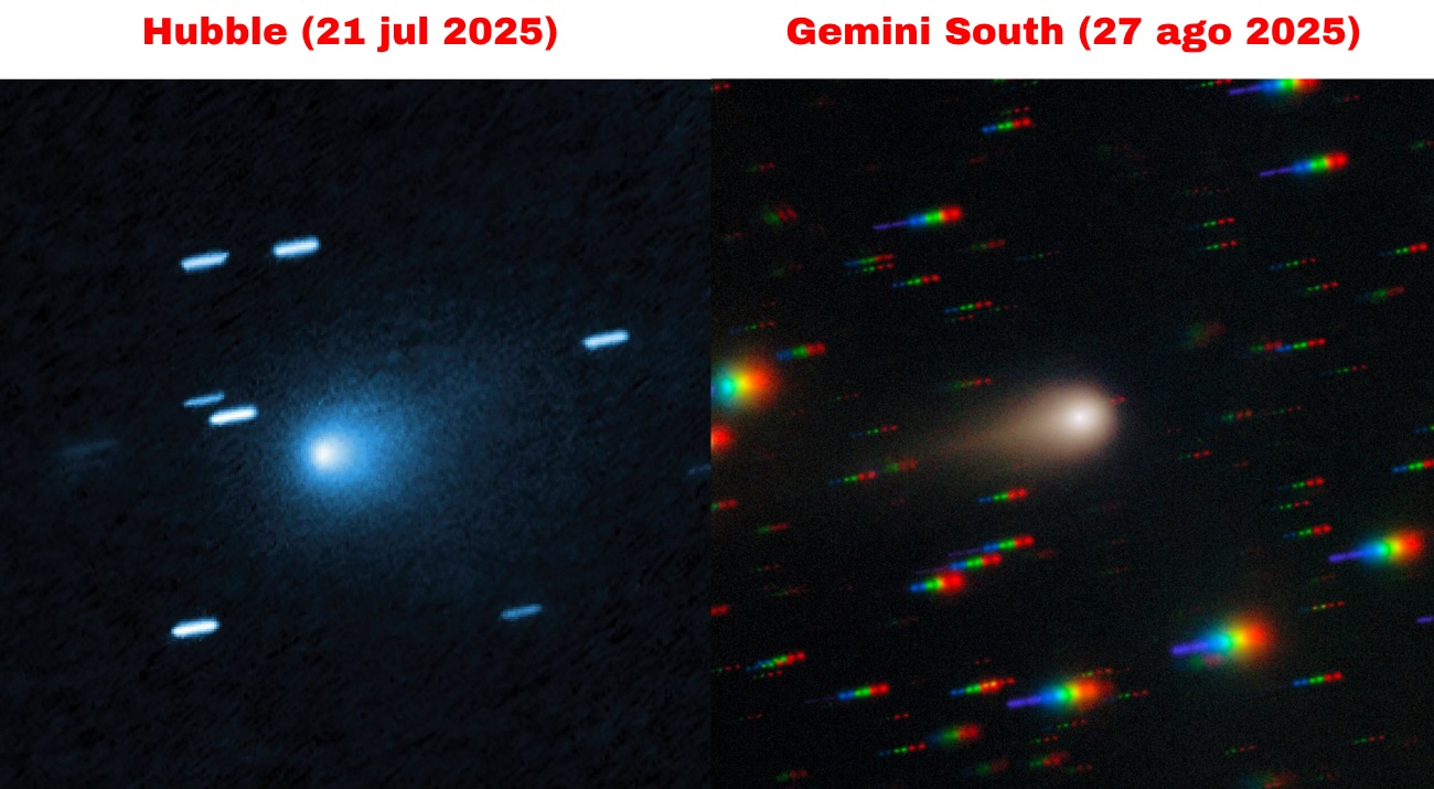 En la imagen del telescopio espacial Hubble, capturada el 21 de julio de 2025, la NASA indicaba que este observatorio capturó “una columna de polvo eyectada del núcleo desde el lado calentado por el Sol, y el indicio de una cola de polvo”. La agencia agregó que 3i/ATLAS pierde polvo a un ritmo similar que otros cometas detectados a unos 480 millones de kilómetros del Sol, “un comportamiento similar de otros cometas de nuestro sistema solar”.