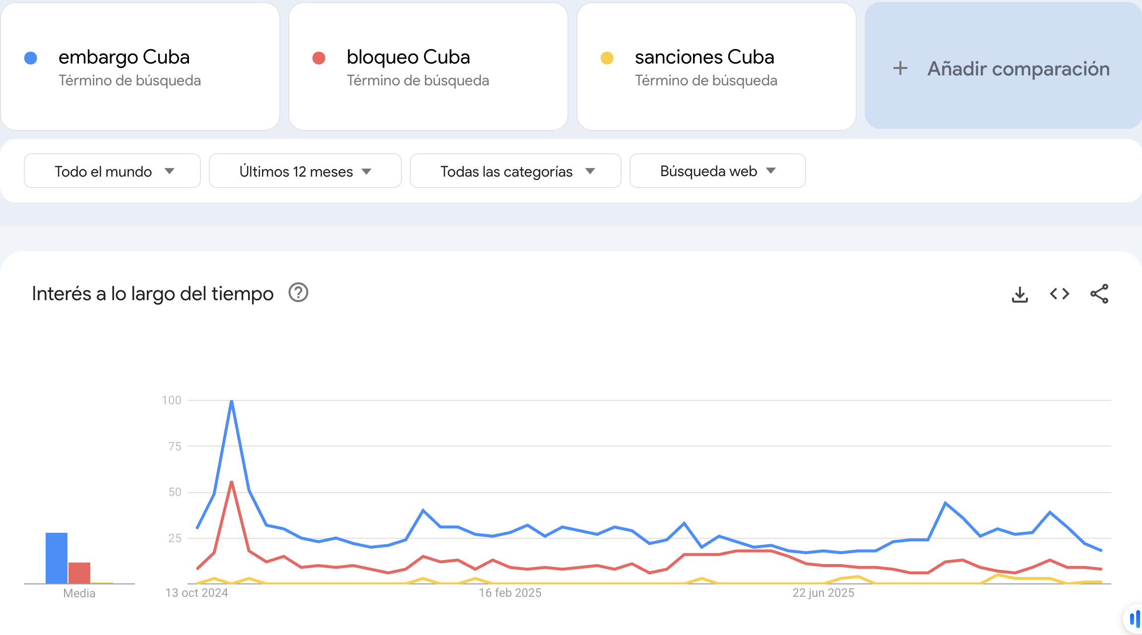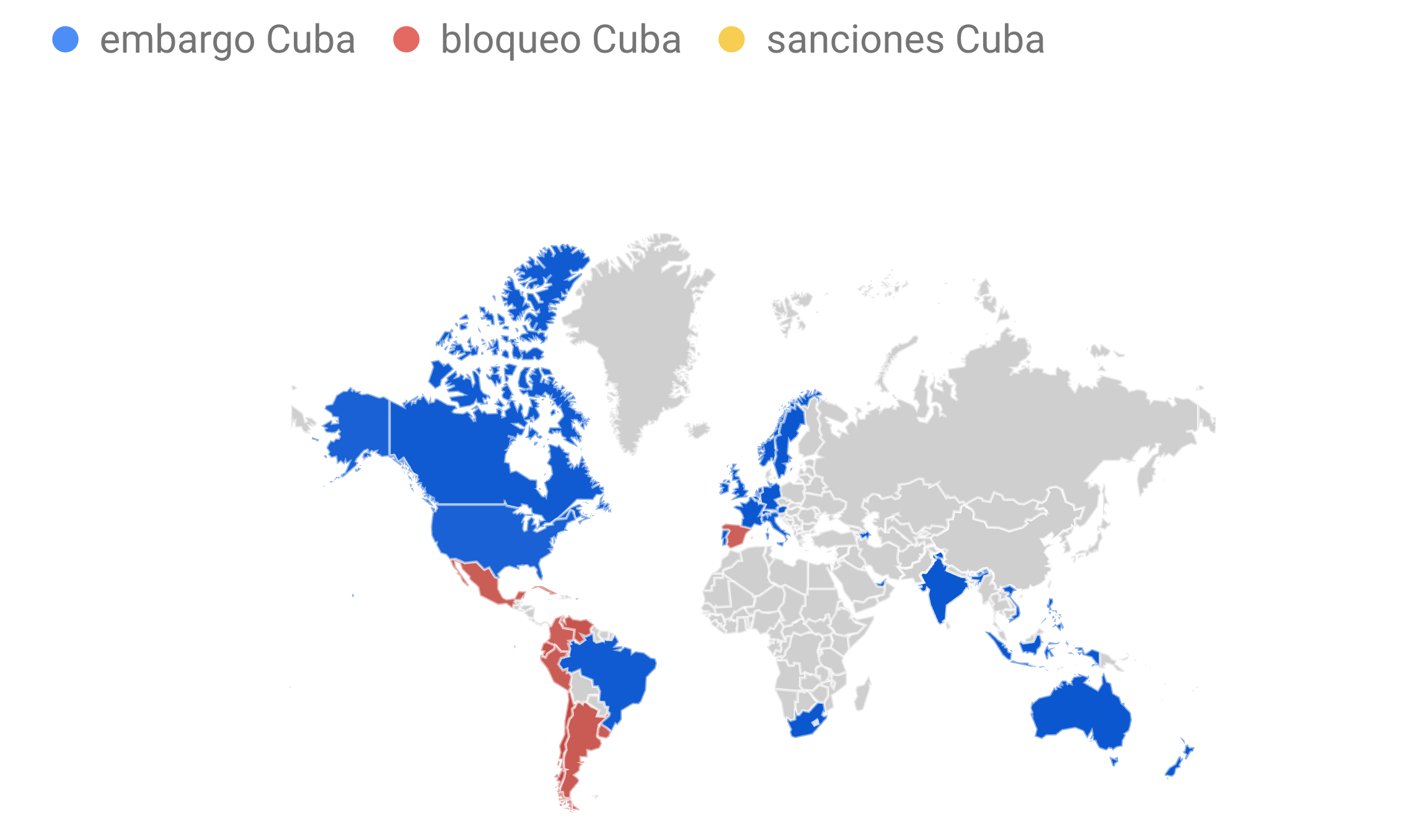 "Bloqueo”: término que ha usado históricamente el Estado cubano y los medios estatales controlados por el Partido Comunista de Cuba (PCC). La narrativa de que “el bloqueo” de Estados Unidos es la principal causa de la crisis en sectores claves (ver aquí, aquí, aquí) también ha sido replicada sistemáticamente por medios estatales de Venezuela, Rusia y China, aliados del gobierno cubano (ver aquí, aquí, aquí) Este enfoque omite las causas estructurales y sistémicas de la crisis que sufre la isla, como explican los más reconocidos economistas independientes del país.