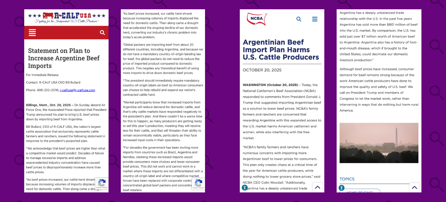 En un comunicado del 20 de octubre de 2025, Bill Bullard, director ejecutivo de R-CALF USA, la asociación de ganaderos más grande de EE. UU., dijo que “el aumento de las importaciones desde Argentina reducirá la demanda de ganado nacional, y es por eso que los mercados de ganado han respondido negativamente al plan del presidente”.