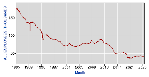 Empleos en la minería del carbón desde enero de 1985 hasta marzo de 2025. Fuente: BLS
