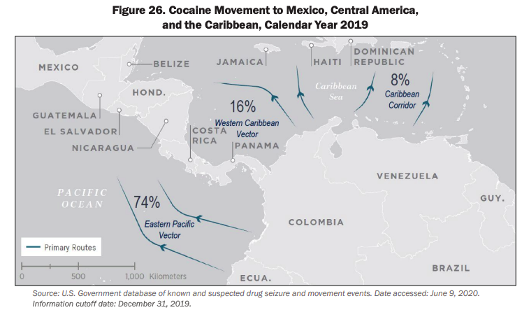 Según un mapa de 2020 de la DEA, el 74% de la cocaína que llegó a México en 2019 provino de las costas del Pacífico de Colombia y Ecuador, mientras que un 8% salió de la costa Caribe venezolana. Según el mapa, un 16% proviene del Caribe occidental (que no incluye Venezuela, según el mapa). No encontramos datos más actualizados de la DEA en reportes públicos. Es en el Caribe donde se han llevado la mayoría de los ataques militares estadounidenses en contra de embarcaciones que supuestamente estaban traficando drogas.