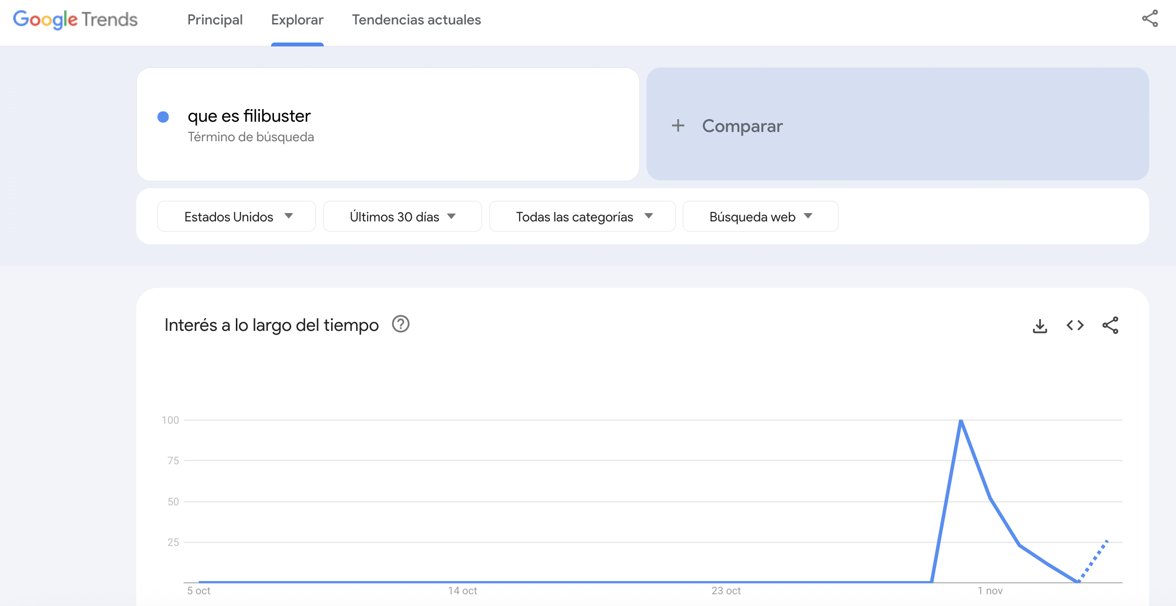 Tras los comentarios de Trump, aumentaron las búsquedas en español sobre “qué es filibuster”, según datos de Google Trends.