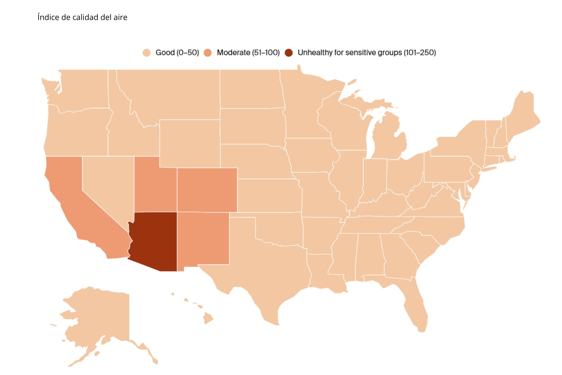 En Arizona, los latinos son el segundo grupo racial y étnico más grande, con un 31% de la población, según el Instituto de Política y Política Latina de la UCLA. El informe achaca el alto Índice de Calidad del Aire en este estado al ozono a nivel del suelo –impulsado por la constante exposición al sol y la falta de cobertura de nubes–, así como a las partículas provenientes del polvo y de los incendios forestales circundantes en el oeste de Estados Unidos.