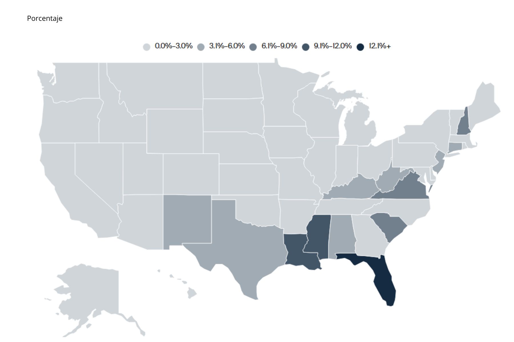 Algunas conclusiones destacan los riesgos específicos que enfrentan estados con una gran proporción de población latina. California y Arizona registran la peor calidad del aire, mientras que Nevada, Nuevo México y Arizona son los más afectados por el calor extremo. Además, casi el 15% de las camas hospitalarias de Florida se encuentran en zonas de alto riesgo de inundación. Te explicamos estas y otras conclusiones del informe.