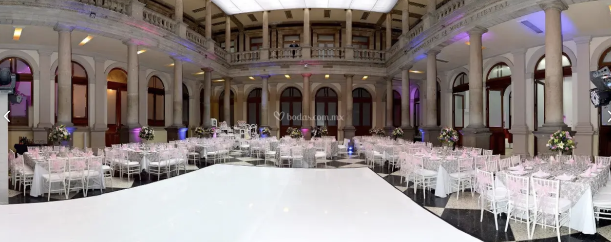 Me encuentro ahora con una mujer que me recibe sonriente y me muestra desde el balcón el patio techado que se renta para fiestas. El piso parece un tablero de ajedrez, con cuadros de mármol que alternan el negro y el blanco bajo múltiples columnas y capiteles perfectamente moldeados. Señala la ubicación de los baños y presume que ahí se han organizado fiestas con diferentes motivos.