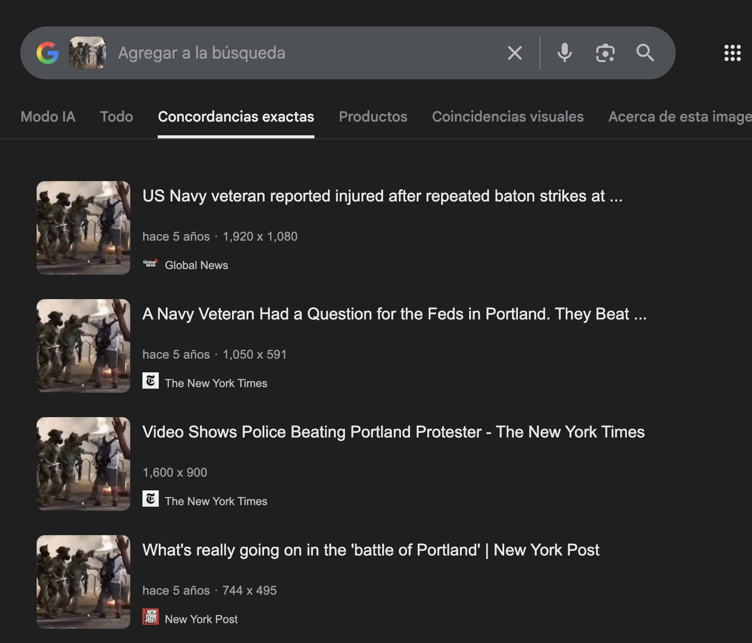 Tomamos una captura de pantalla para hacer una búsqueda inversa en Google Lens y encontramos que el video circula al menos desde el 19 de julio de 2020. Entre los resultados está un artículo por The New York Times donde se indica que la persona del video era un veterano de la Marina que también fue golpeado con una batuta.