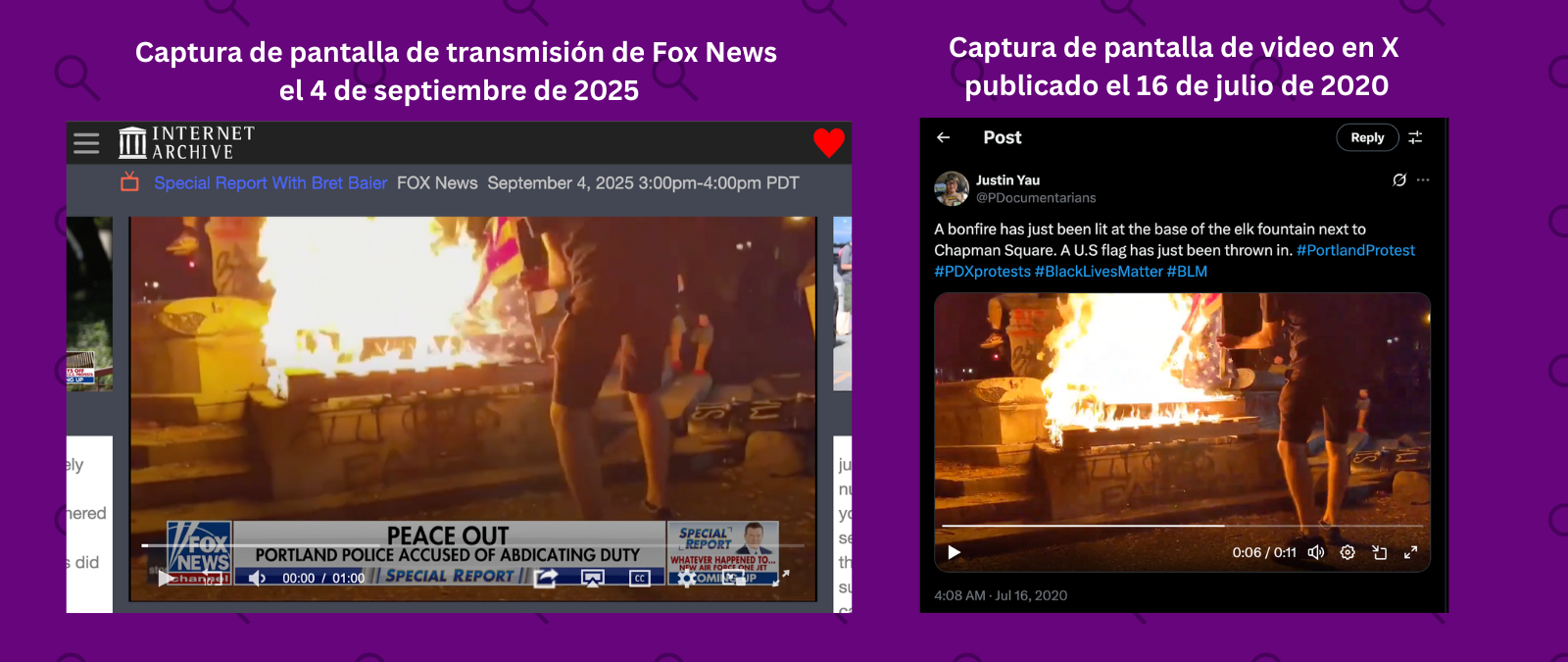 Las imágenes transmitidas por la cadena Fox News no incluyeron en el momento de la transmisión en vivo rótulos o textos que indiquen que algunos de los videos no eran actuales. La secuencia de casi dos minutos y medio se encuentra disponible en la página web de la cadena y actualmente puede leerse en la descripción del video el aviso: “Nota del editor: Este video contiene imágenes de las protestas en Portland en 2020 y 2025”.