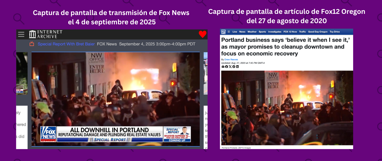 Cuando Fox News transmitió las protestas en contra de operativos de inmigración en Portland, Oregón, el 4 de septiembre de 2025, incluyó imágenes de manifestaciones antiguas , algunas de 2020, sin indicarlo. Varios de los videos sacados de contexto que se incluyeron corresponden a manifestaciones ocurridas tras la muerte de George Floyd, un hombre afroamericano que falleció después de que un policía le presionara el cuello con la rodilla por unos nueve minutos el 25 de mayo de 2020.
