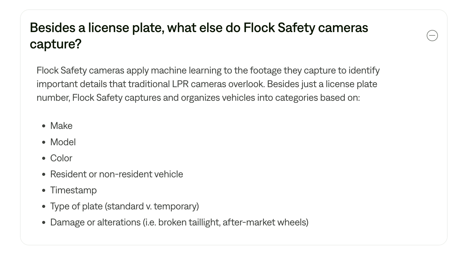 Los sistemas de Flock funcionan con energía solar y pueden leer “las matrículas y características de los vehículos y registrar la fecha, la hora y la ubicación de cada observación en la carretera”. Aparte de la matrícula, las cámaras Flock pueden capturar y organizar los vehículos en categorías basadas en la marca, modelo, color, vehículo de una persona residente o no residente, marca de tiempo, tipo de matrícula (estándar o temporal) o daños o alteraciones (como una luz trasera rota o llantas de repuesto). “Toda esta información se elimina de manera permanente y de forma continua, generalmente después de 30 días”, según explica un artículo de la compañía del 1 de diciembre de 2025.