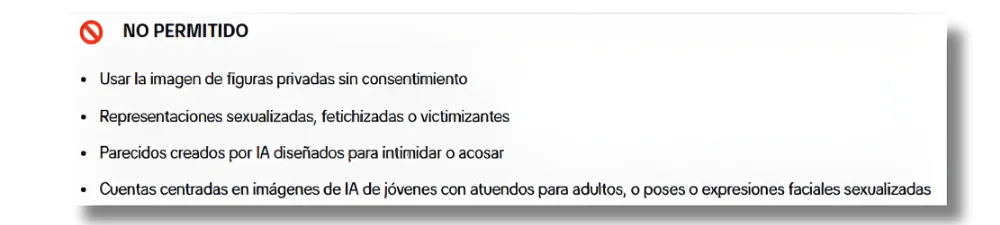En las normas de la red social se afirma que “cuentas centradas en imágenes de IA de jóvenes con atuendos para adultos, o poses o expresiones faciales sexualizadas” están prohibidas. También lo dice de los contenidos creados con inteligencia artificial de “representaciones sexualizadas, fetichizadas o victimizantes”. Sin embargo, en Maldita denunciaron una selección de 15 perfiles usando los canales habilitados para ello por TikTok: 72 horas después, todas las cuentas denunciadas seguían estando disponibles en la plataforma. TikTok consideró que no existía violación de sus políticas en la gran mayoría de los casos, salvo en una cuenta, a la que le impuso restricciones temporales que no impedían acceder su contenido.