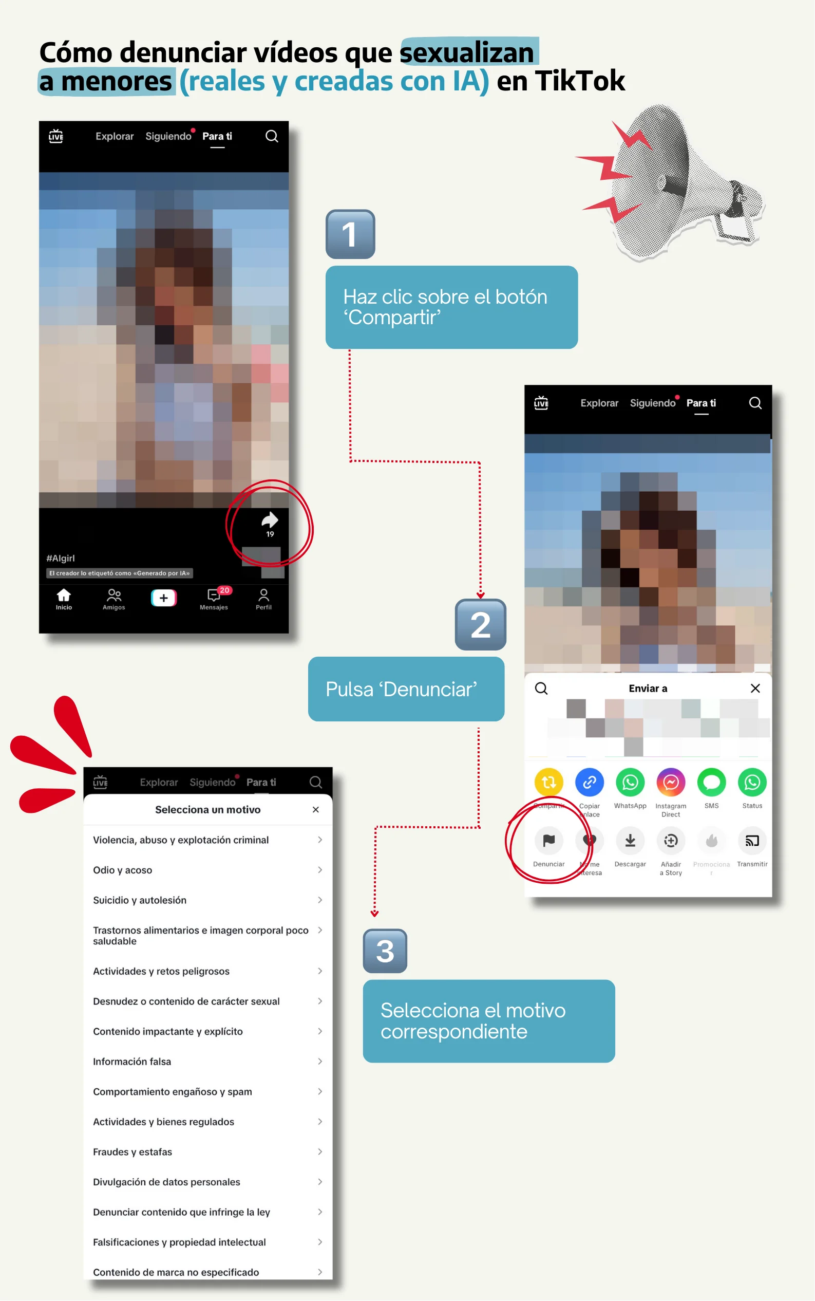 Rahul Uttamchandani, abogado especializado en tecnología y privacidad, explicó a Maldita que como usuarios, podemos denunciar este tipo de contenido para que conste que las plataformas han sido notificadas. Para hacerlo, en TikTok debemos pulsar el botón ‘compartir’, presionar ‘denunciar’ y seleccionar el motivo correspondiente.