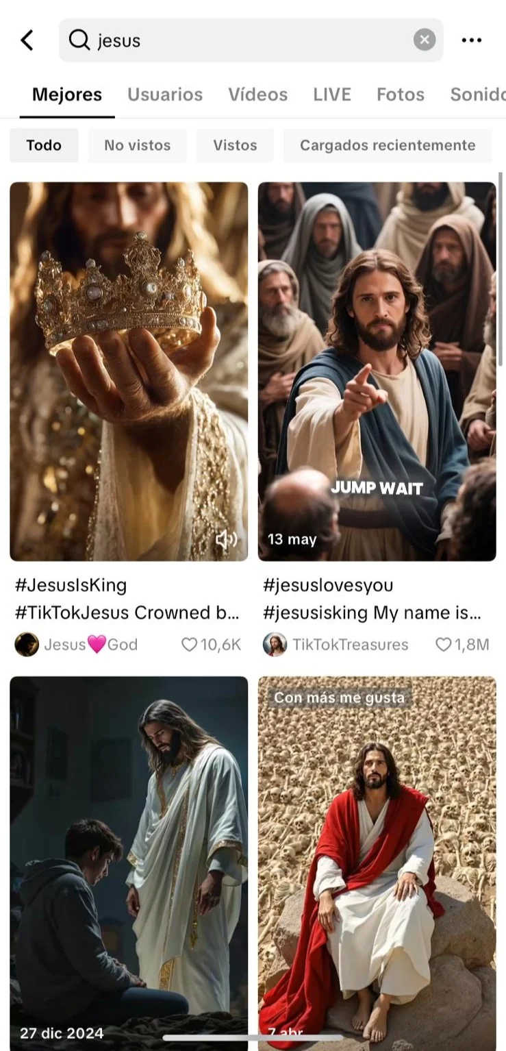 De las imágenes en Facebook, la representación con IA de Jesucristo ha dado el salto al video y a plataformas como TikTok. Una búsqueda de la palabra “Jesús” en esta red social nos devuelve decenas de videos creados con inteligencia artificial de esta figura religiosa, que acumulan millones de visualizaciones y ‘Me gusta’. También los podemos encontrar en otras redes sociales, como Instagram y X (antes Twitter). Muchos de estos videos tienen la marca de agua de Sora, la nueva red social de OpenAI que permite crear videos con IA y compartirlos con otros usuarios.
