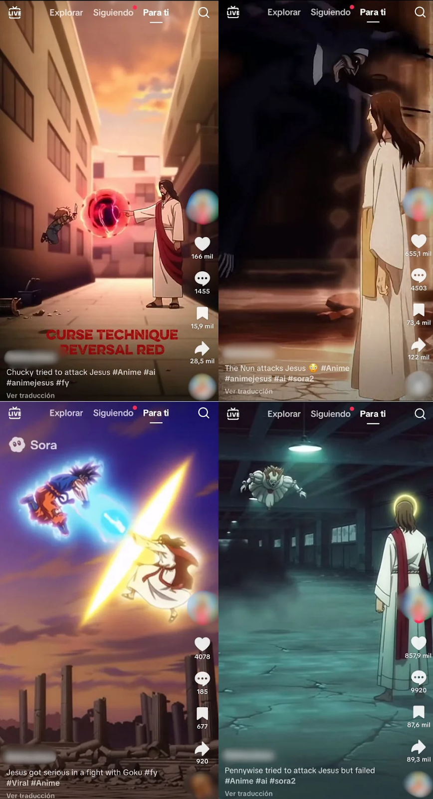 También los hay con mensajes religiosos más claros, como videos creados con IA de Jesús consolando a personas, o de la figura religiosa recibiendo a niños en el cielo. Por ejemplo, un video creado con IA muestra a Jesucristo pidiendo (en portugués) que compartamos el video con tres personas para ver un milagro: tiene 4.6 millones de visualizaciones. En otro de este estilo, el personaje bíblico pide a los usuarios mandar el video a la mayor cantidad de personas que pueden para recibir una bendición y que se cumplan nuestros deseos; ha sido visto 12.6 millones de veces.