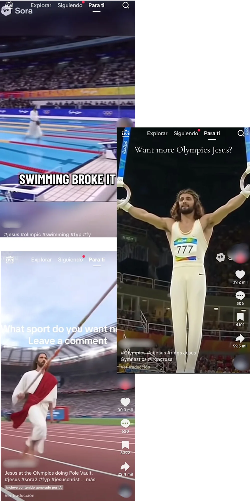 También están los videos de Jesucristo participando en competiciones de los Juegos Olímpicos, una tendencia que, en otros casos, se está usando para perpetuar narrativas y estereotipos sobre las mujeres, inmigrantes y judíos. Por ejemplo, uno de estos videos creados con Sora muestra a Jesús en una competición de natación, que gana caminando sobre el agua (como cuenta el relato bíblico). Otro lo representa participando del salto con pértiga pero, en lugar de caer en el suelo, la figura religiosa se eleva hasta el cielo. También hay un video que lo muestra colgándose de aros de gimnasia para hacer una cruz. En total, estos tres videos alcanzan unas 3.3 millones de visualizaciones.