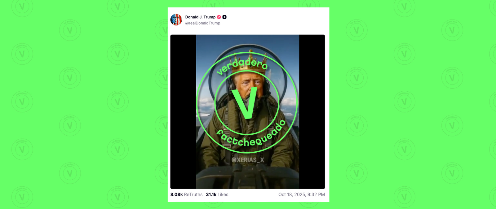 En octubre de 2025 verificamos que sí, que el presidente Donald Trump, en efecto, había compartido en Truth Social un video generado con IA en el que aparece vestido con un uniforme de piloto militar y una corona, piloteando un jet de combate. En la aeronave se lee la frase "King Trump" ("Rey Trump").