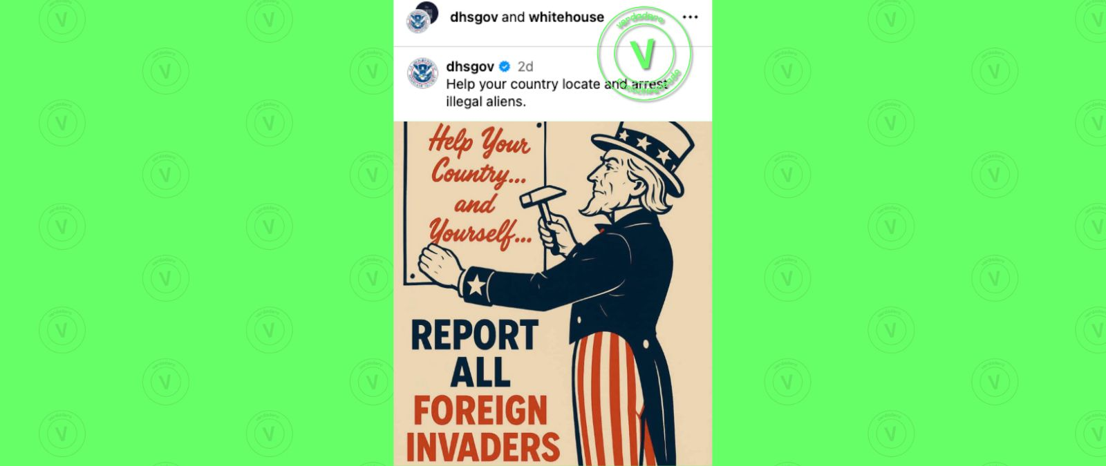 En junio de 2025 verificamos que la Casa Blanca y el Departamento de Seguridad Nacional (DHS) publicaron en sus redes sociales una imagen con el texto “reporta a todos los invasores extranjeros”, el número de contacto de ICE (Servicio de Inmigración y Control de Aduanas) y una figura del “Tío Sam” clavando un cartel en una pared que dice “ayuda a tu país y a ti mismo”.