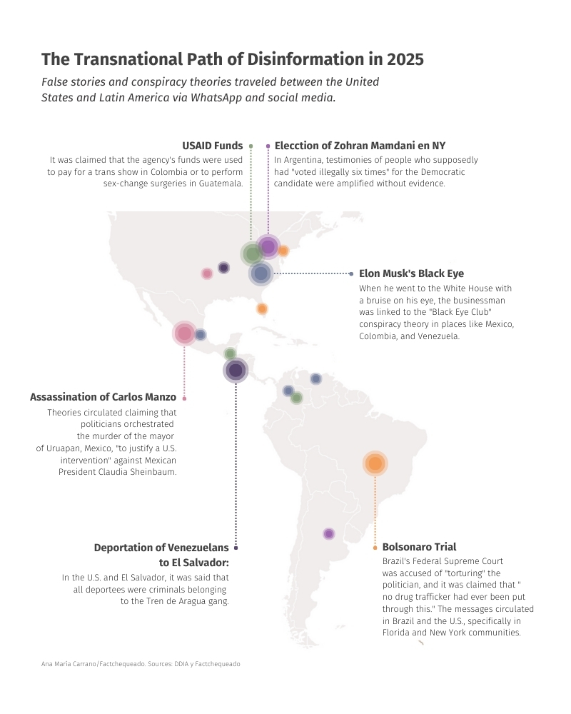 Among what we observed, we found that, more than language, ideological alignment was what facilitated the circulation of these narratives in 2025. We also confirmed that falsehoods go viral following controversial, high-impact news events—such as elections, political trials, or assassinations—and how high-profile figures help spread them and expand their reach.