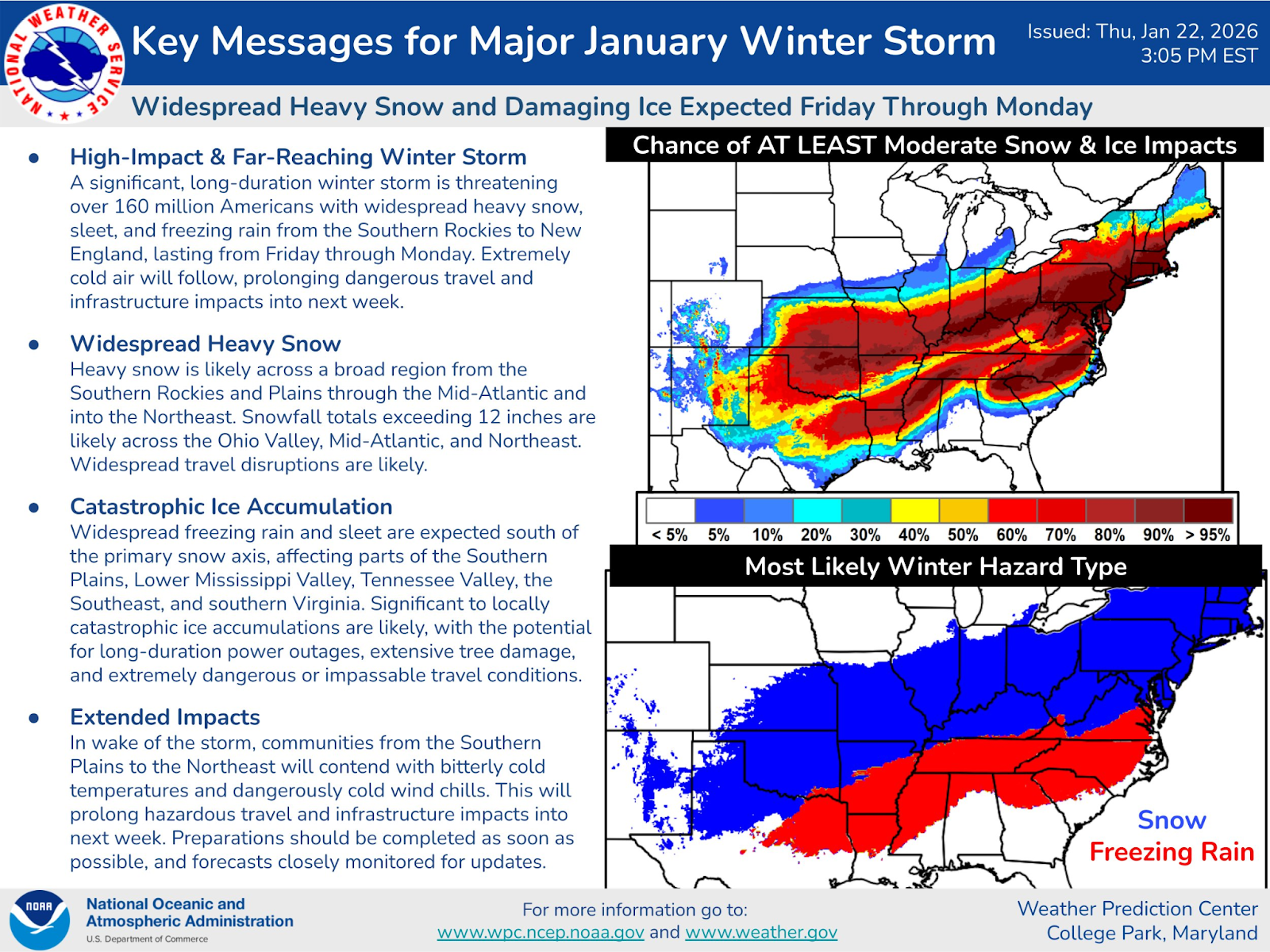 El Servicio Meteorológico de Estados Unidos (NWS) anunció una gran tormenta invernal que impactará buena parte del país entre el viernes 23 de enero y el lunes 26 de enero de 2026 y que podría afectar a 160 millones de personas en Estados Unidos. *