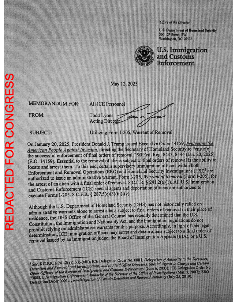 En el memorando divulgado por Whistleblower Aid —y publicado primero por la agencia de noticias AP—, Lyons escribió que “aunque históricamente el Departamento de Seguridad Nacional de los Estados Unidos (DHS) no ha recurrido únicamente a órdenes administrativas para arrestar a extranjeros sujetos a órdenes finales de deportación en su lugar de residencia, la Oficina del Asesor General del DHS ha determinado recientemente que la Constitución de los Estados Unidos, la Ley de Inmigración y Nacionalidad y las regulaciones de inmigración no prohíben recurrir a órdenes administrativas para este propósito”.
