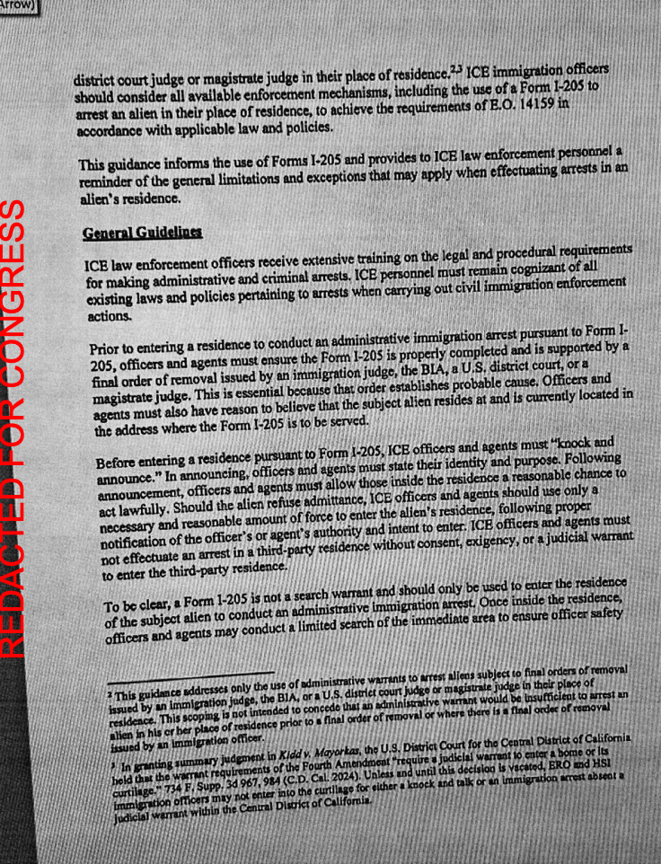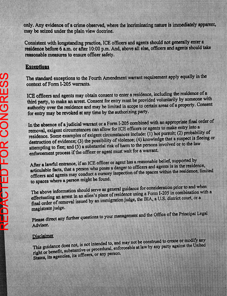En la práctica, el memo autoriza a que los agentes de ICE se basen en el Formulario I-205, una orden administrativa de remoción/deportación, para entrar por la fuerza en el hogar de alguien. Pero la organización señala que esta “política” (refiriéndose al formulario) no autoriza a los agentes de ICE a entrar en un hogar.