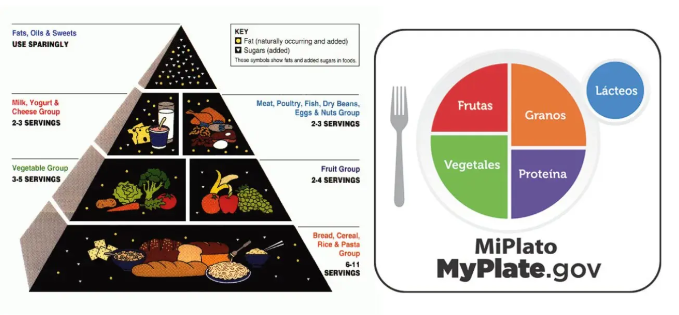 Sin embargo, en 2011 el modelo cambió a MyPlate, que representa la proporción en el plato de cada grupo de alimentos.