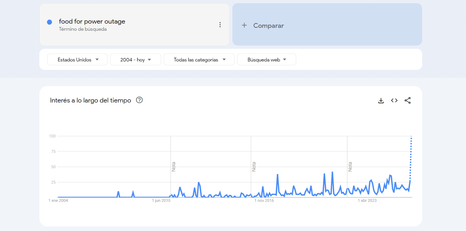 Búsquedas en Google en Estados Unidos de “food for power outage” (comida para apagones, en español).