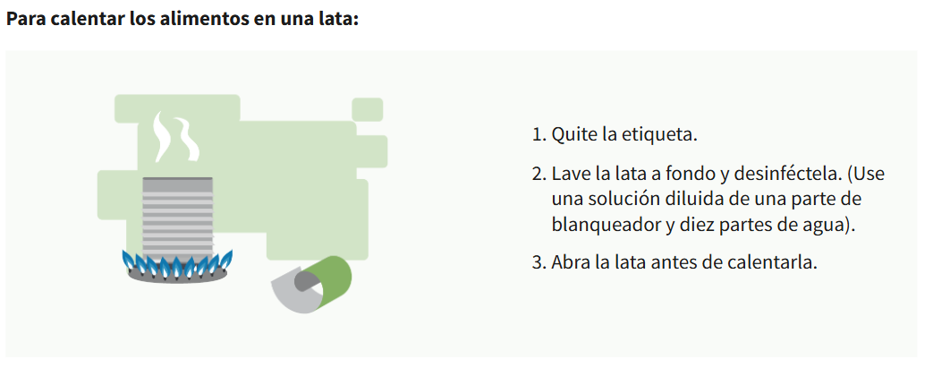 Los alimentos enlatados comercialmente se pueden comer directamente de la lata, sin necesidad de calentarlos. Si se quieren calentar, el DHS sugiere hacerlo así: