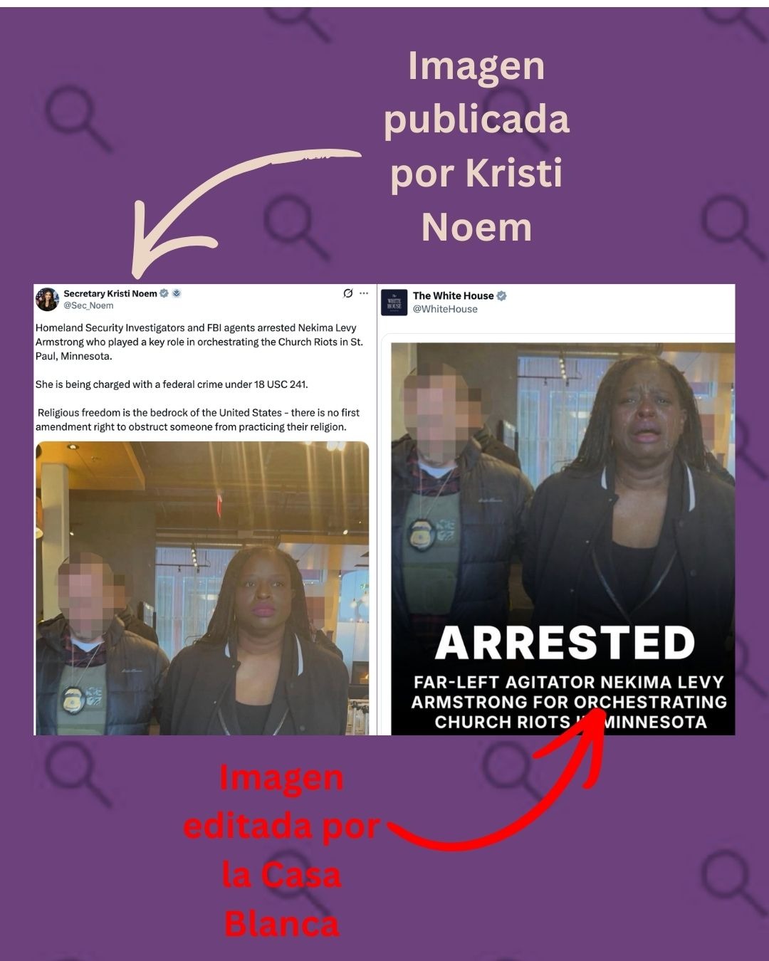 La Casa Blanca, el 22 de enero de 2026, publicó una imagen editada que mostraba llorando a la activista Nekima Levy tras ser detenida por protestar dentro de una iglesia de St. Paul, Minnesota. En la imagen original, publicada casi media hora antes por Kristi Noem, secretaria del Departamento de Seguridad Nacional, la mujer no está llorando. Kaelan Dorr, vocero de la Casa Blanca, defendió el uso de la imagen alterada afirmando: “Los memes continuarán”. Levy fue imputada por el Departamento de Justicia (DOJ) por supuestamente conspirar para obstruir el ejercicio constitucional de la libertad de religión. Su caso sigue en proceso en corte.