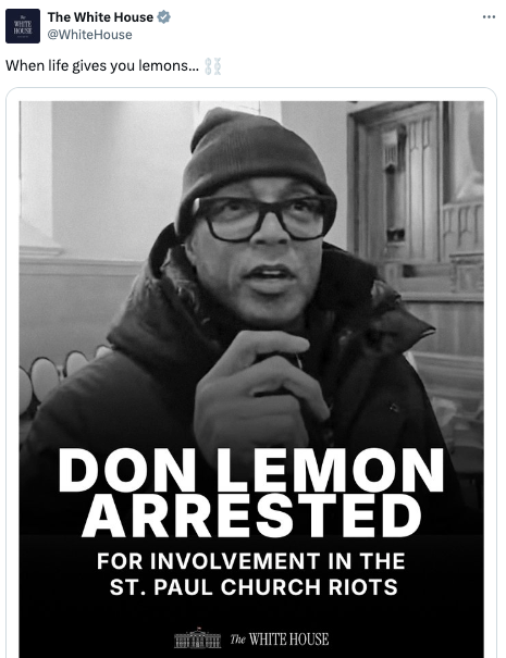 El 30 de enero de 2026, la Casa Blanca celebró la detención del periodista Don Lemon, quien estuvo documentando la manifestación dentro de la iglesia en Minnesota, publicando una foto de Lemon, con el mensaje: “Cuando la vida te da limones…”, seguido de un emoji de unas cadenas. El DOJ también imputó a Lemon de conspirar para interferir con la libertad de religión, pero el periodista afirma que estaba documentando la protesta y que no era un participante. Su caso en corte también continúa.