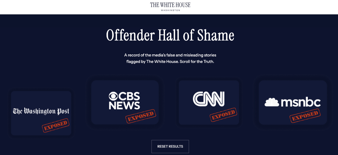 Además, la Casa Blanca creó una sección en su página web llamada “El salón de la vergüenza”, en donde mantiene un “registro de las historias falsas y engañosas de los medios”. La página incluye una lista de supuestas “ofensas” del medio de comunicación y el nombre de los periodistas.