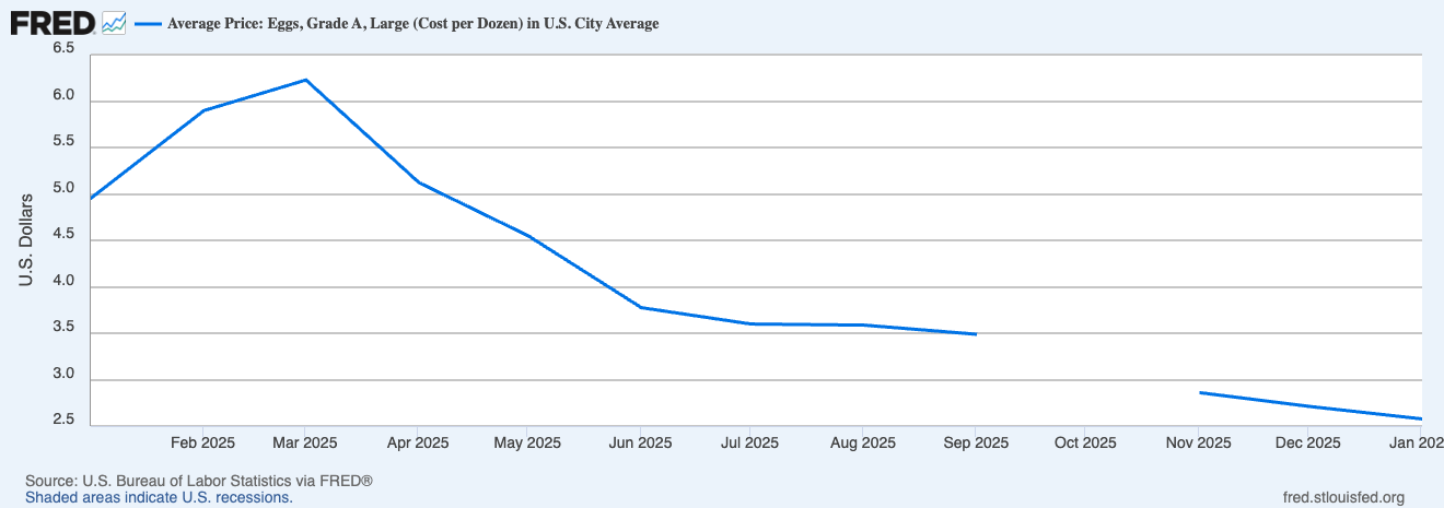 Trump afirmó que “el precio de los huevos ha bajado un 60%”. Si bien es cierto que los precios bajaron ese porcentaje desde su pico más alto (6.2 dólares en marzo de 2025 a 2.6 en enero de 2026), la reducción es de alrededor de 48% si comparamos de enero 2025 a enero 2026.