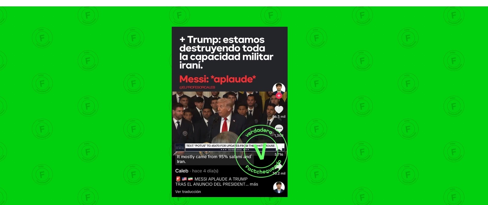Una publicación viral en TikTok –que cuenta con más de 80,000 “Me gusta” y casi 30,000 compartidos– muestra un fragmento del discurso del presidente en la visita del Inter Miami a la Casa Blanca. El posteo afirma que Messi aplaudió luego de que Trump afirmara que su país estaba destruyendo la capacidad militar iraní.