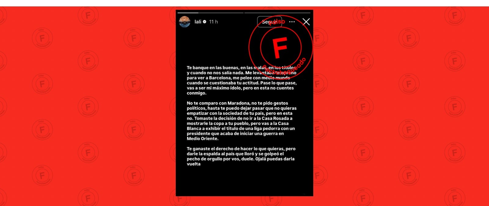 Circuló en redes un supuesto posteo de la cantante argentina Lali Espósito en contra del jugador. “Pase lo que pase, vas a ser mi máximo ídolo, pero en esta no cuentes conmigo”, dice el texto de la supuesta historia de Instagram.