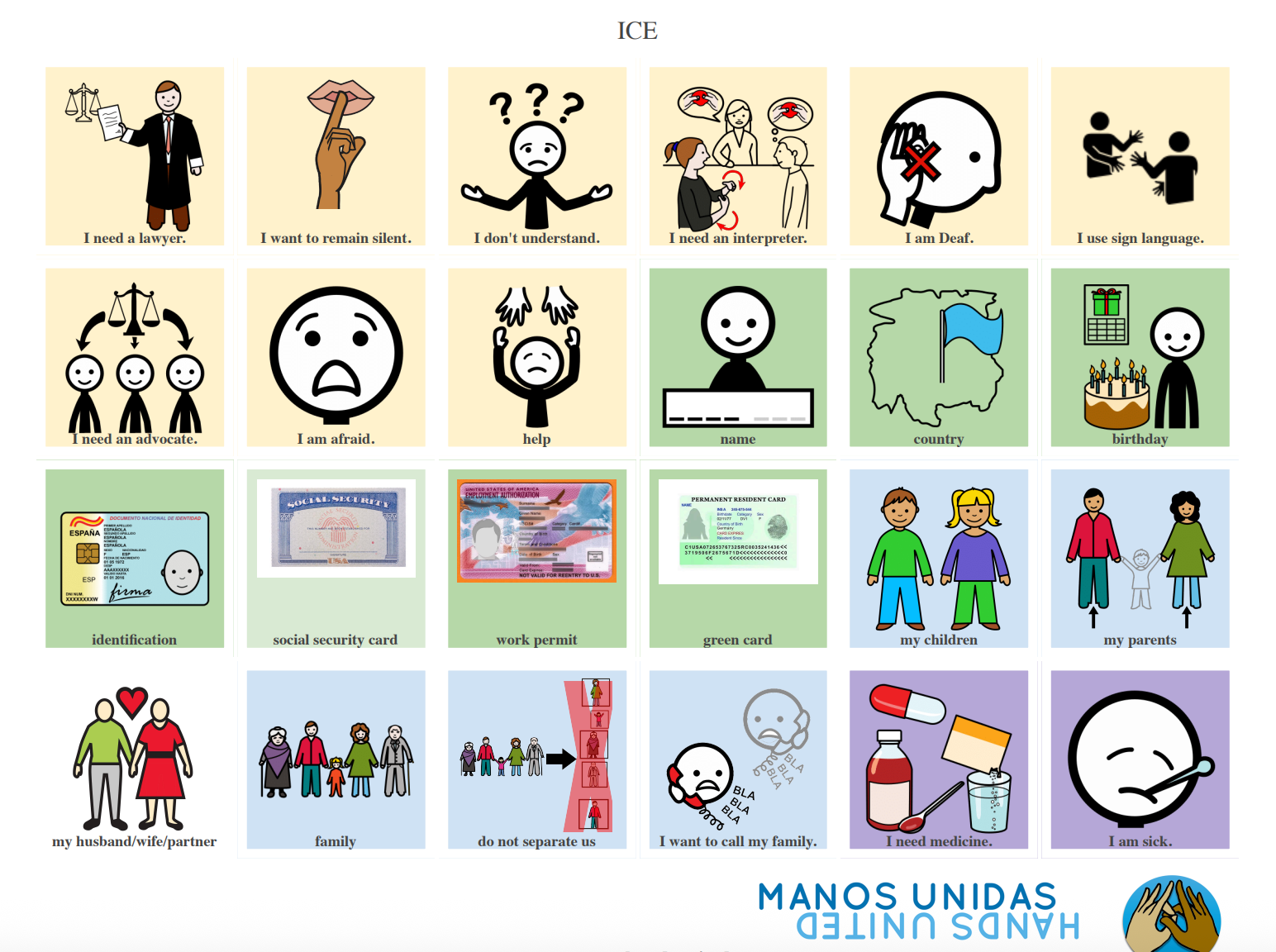 Tabla de comunicación: para situaciones donde no es posible escribir ni hablar, estas tablas permiten pedir cosas básicas, identificarse y solicitar un intérprete o un abogado. Puedes descargarla aquí.
