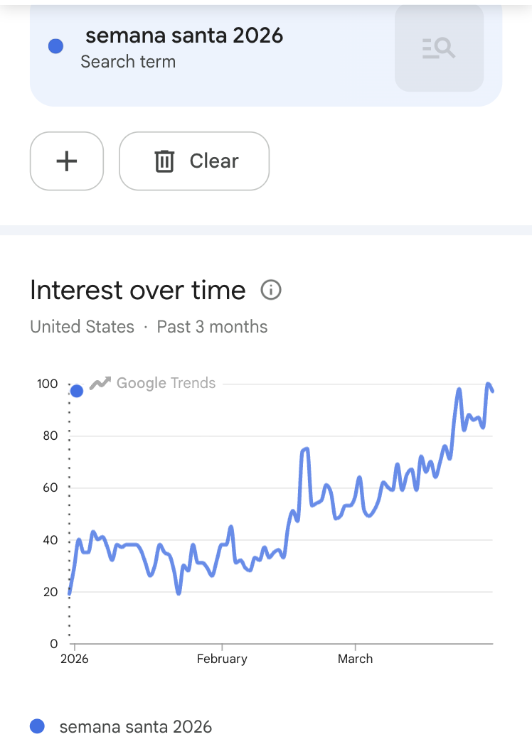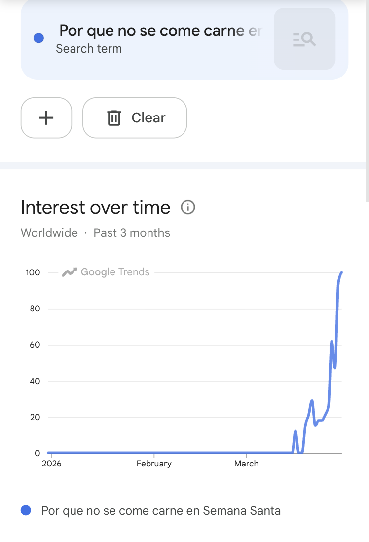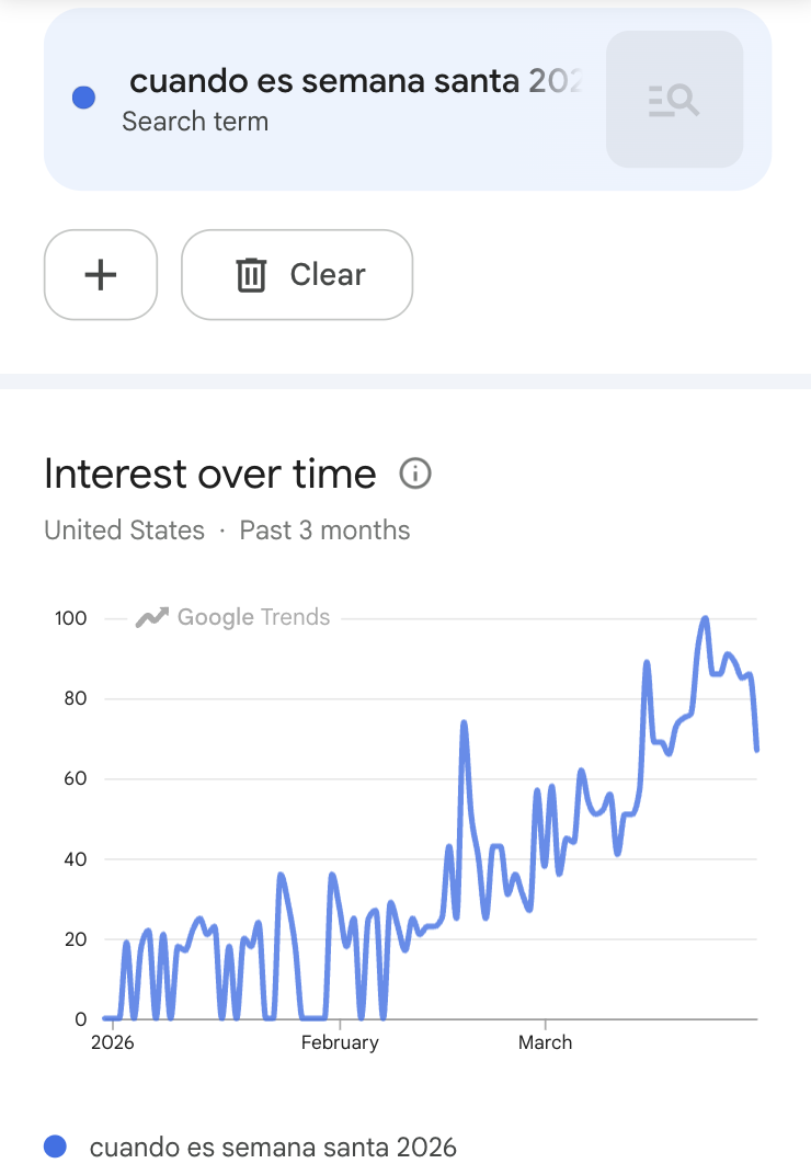 En Estados Unidos, las búsquedas sobre “Semana Santa” con frases como “Semana Santa 2026” o "cuándo es Semana Santa 2026” han ido en aumento desde febrero, según Google Trends. Fuera de Estados Unidos, destaca el incremento de la búsqueda “por qué no se come carne en Semana Santa” (un acto visto como penitencia y sacrificio los viernes de la Cuaresma y en Viernes Santo) en países como Colombia, España, Panamá, Guatemala y México.