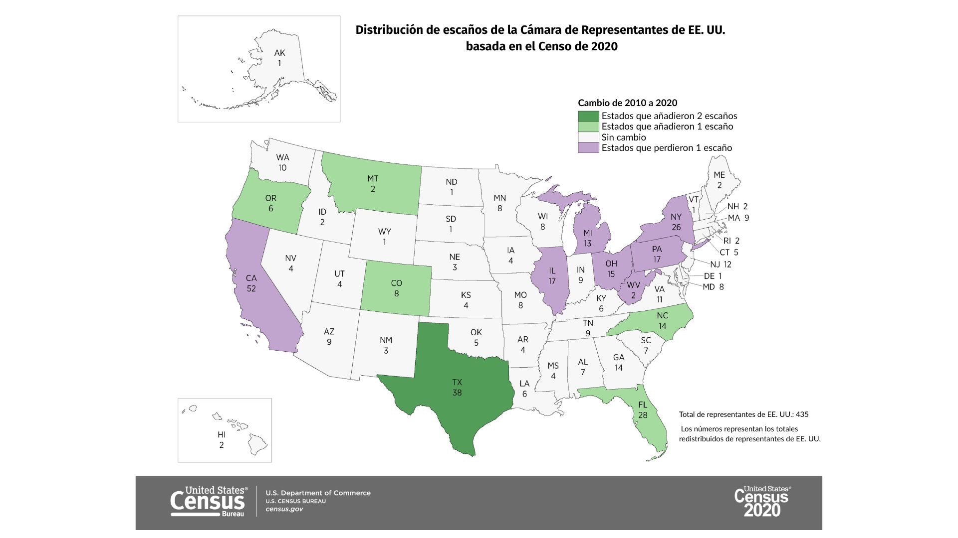 Algunos estados tienen más representantes que otros. Por ejemplo, California tiene 52 mientras que Illinois tiene 13; Kansas, 4 y Dakota del Sur, 1. Esto ocurre porque la cantidad de representantes de cada estado va en función a la cantidad de población establecida en el censo poblacional que se lleva a cabo cada 10 años. Para las elecciones de 2026 se utilizarán los resultados del censo más reciente, el de 2020.
