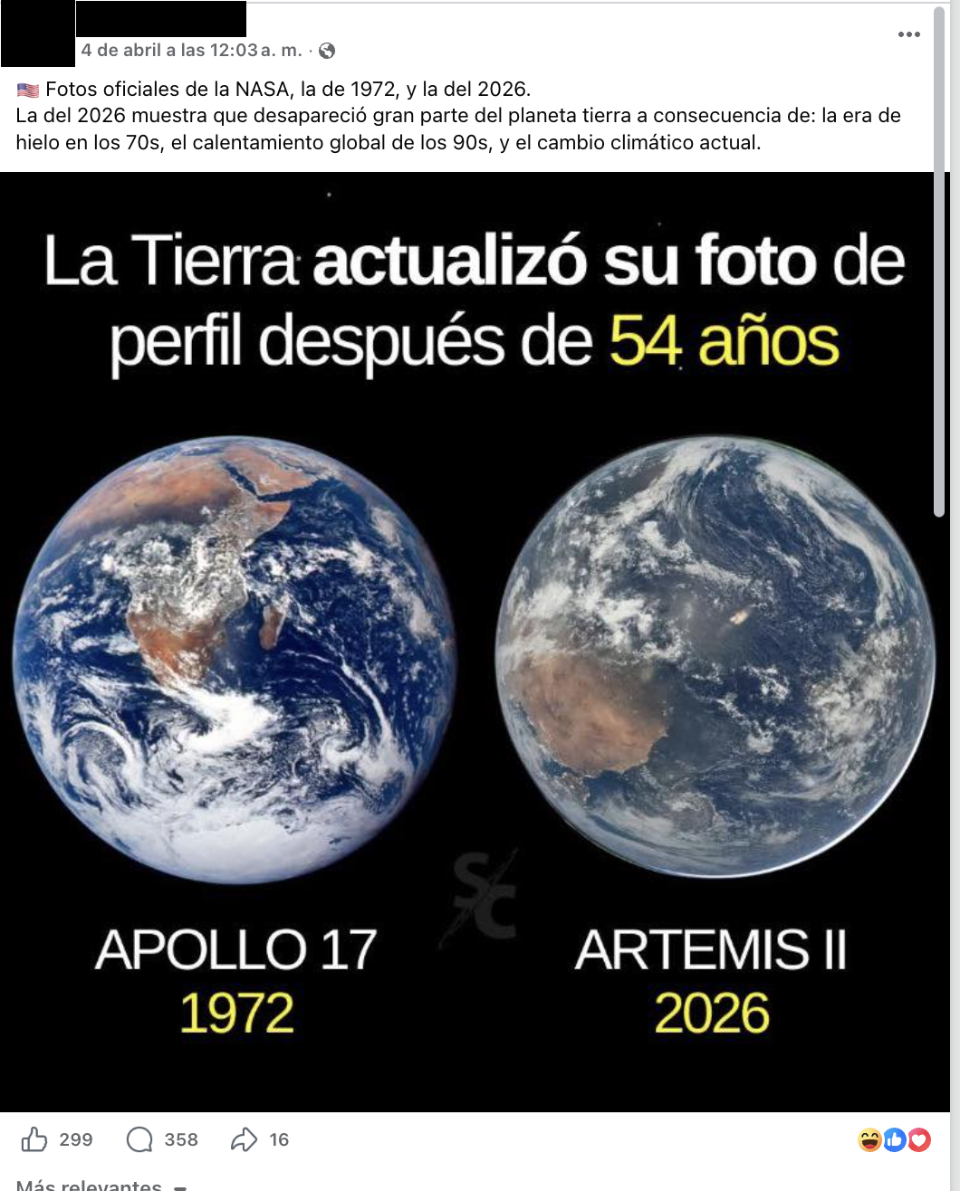 “La [foto] de 2026 muestra que desapareció gran parte del planeta Tierra a consecuencia de: la era de hielo en los 70s, el calentamiento global de los 90s, y el cambio climático actual”, dijo otro usuario en una publicación, con casi 300 reacciones y 358 comentarios, en Facebook.