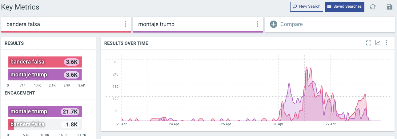 Minutos después de que ocurriesen los tiroteos, la frase “bandera falsa” y las oraciones que relacionaban “Trump” y “montaje” se dispararon en Facebook, Instagram, X, y YouTube, desde cuentas basadas en México, Estados Unidos y Canadá, de acuerdo con un análisis hecho por Factchequeado en la herramienta Talkwalker de Hootsuite.