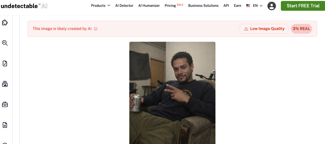 Sin embargo, la imagen tiene inconsistencias y algunas herramientas detectan que pudo ser generada con inteligencia artificial, como Undetectable AI y Deep AI, que dan como resultado que la imagen fue generada con IA.