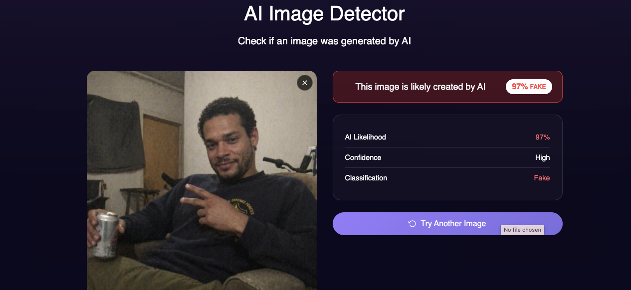 No todas las herramientas dieron un alto grado de probabilidad de que la imagen haya sido generado con IA (por ejemplo, Hive Moderation arrojó un 2.2% de probabilidad que lo fuese y Sight Engine, un 48%), pero es allí donde la observación es clave.